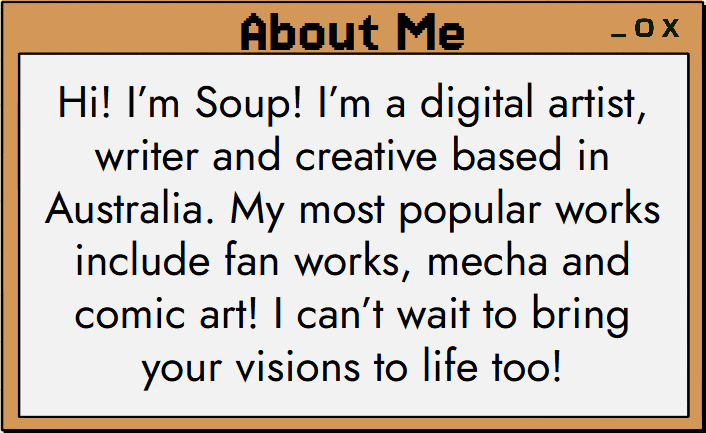 Hi! I’m Soup! I’m a digital artist, writer and creative based in Australia. My most popular works include fan works, mecha and comic art! I can’t wait to bring your visions to life too!